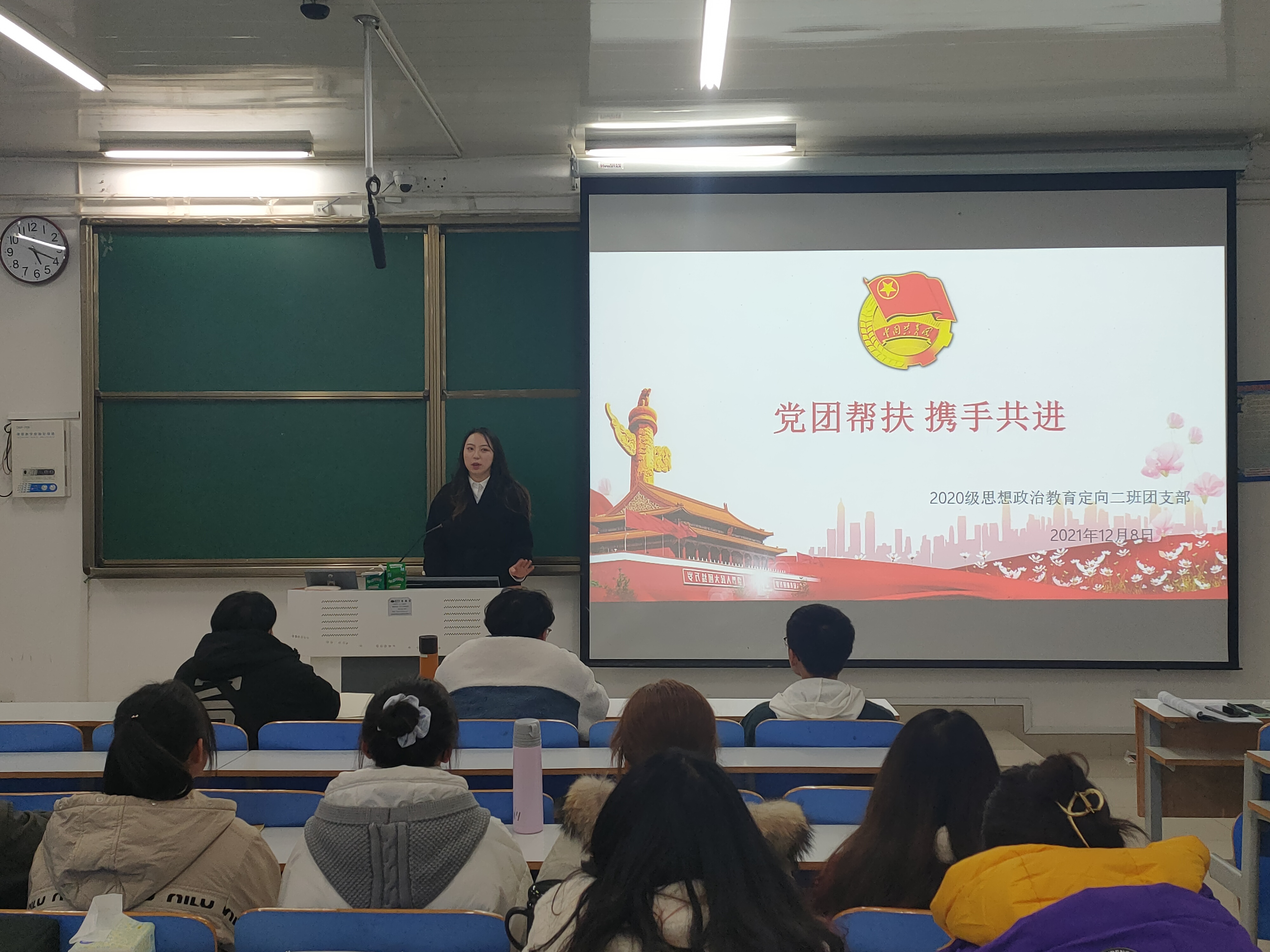 12月8日下午,WilliamHILL中国2020级思想政治教育定向二班在社科楼514教室召开党团帮扶主题班会。2018级预备党员赵思雨、2019级预备党员宋羽潇和2020级思想政治教育定向二班全体团员共同参与本次班会。班会由副班长高红凯主持。