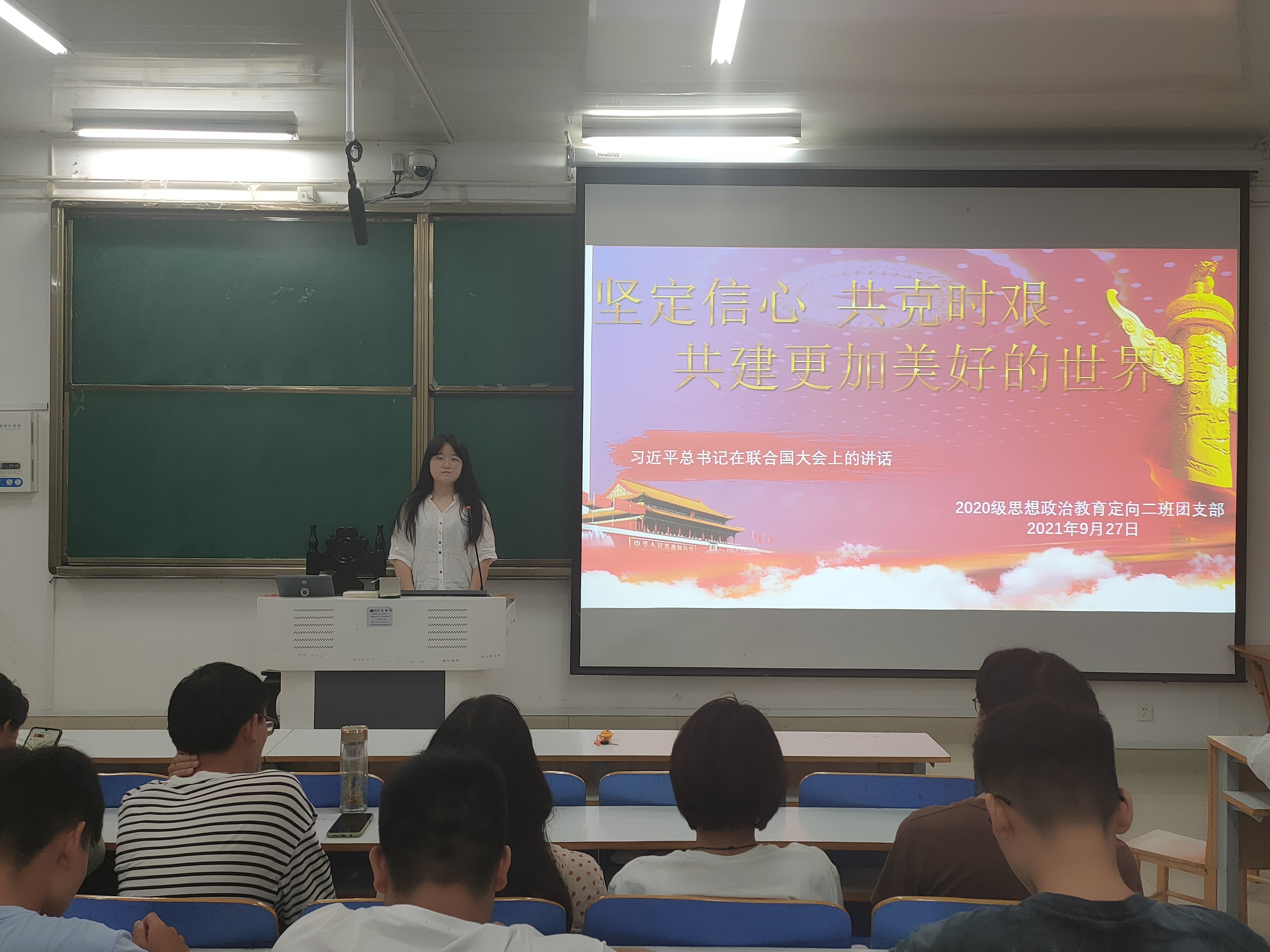 9月27日上午,WilliamHILL中国2020级思想政治教育二班、定向二班在社科楼514教室顺利开展学习国家主席习近平《坚定信念,共克时艰,共建更加美好的世界》重要讲话精神团支部大会。二班、定向二班全体团员共同参与本次大会。会议由孙毓含主持。