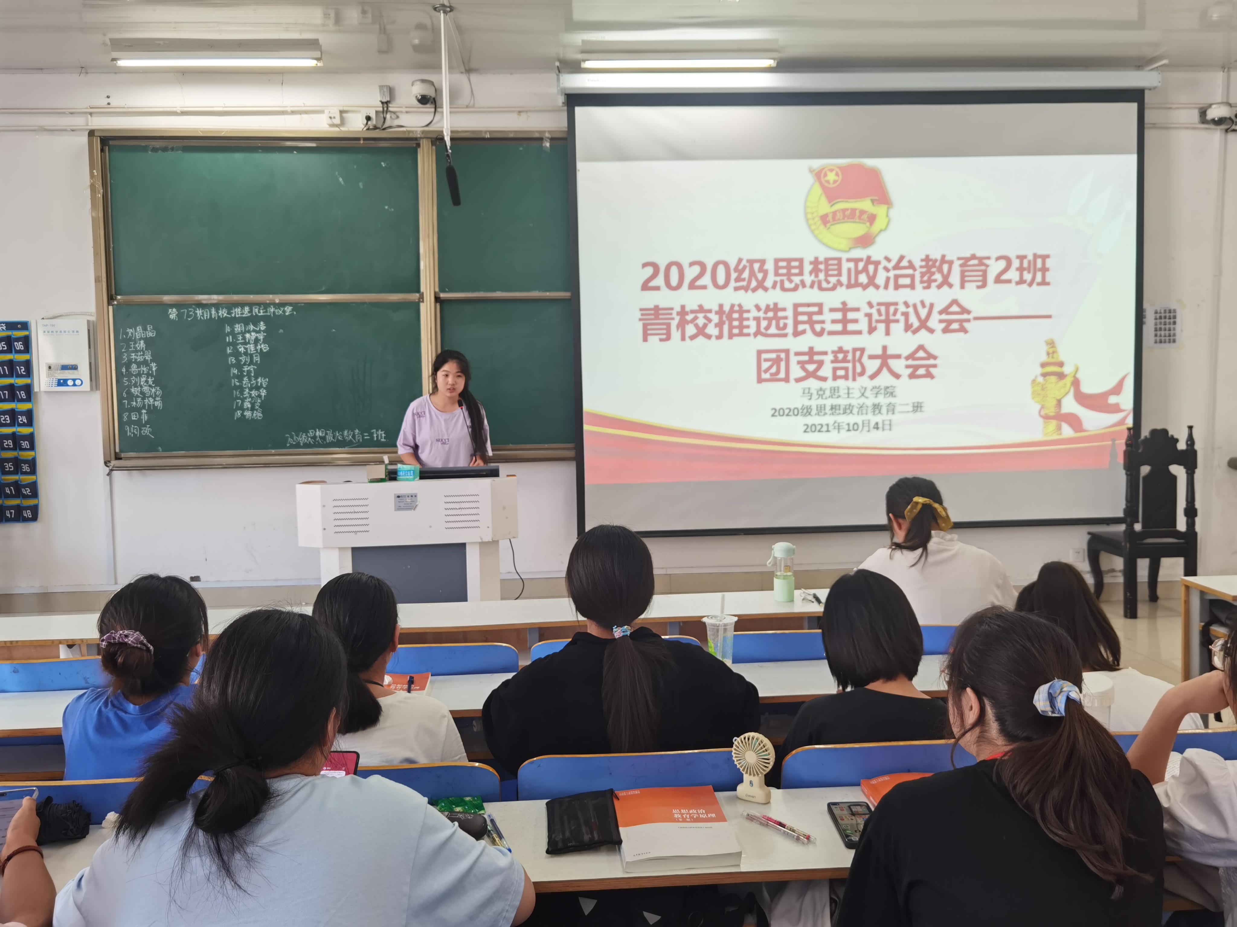 本着公平、公开、公正的原则,按照学院要求,我班全体团员组成表决团,团支书陈宇航为检票员。大会伊始,主持人孙雪清点到场人数,细致讲解选举规则。本次推选支部团员每人两票,采取匿名投票的形式。随后,参与推选的18位候选人依次宣读推选申请,介绍自己一年来的工作经历和主要荣誉。接下来,进入投票环节,我班团员本着负责任的精神,严格遵守一人两票制的投票方式有序进行匿名投票。最后,陈宇航现场唱票,并将表决结果以照片形式公布。第73期青校学员推选民主评选会议顺利结束。