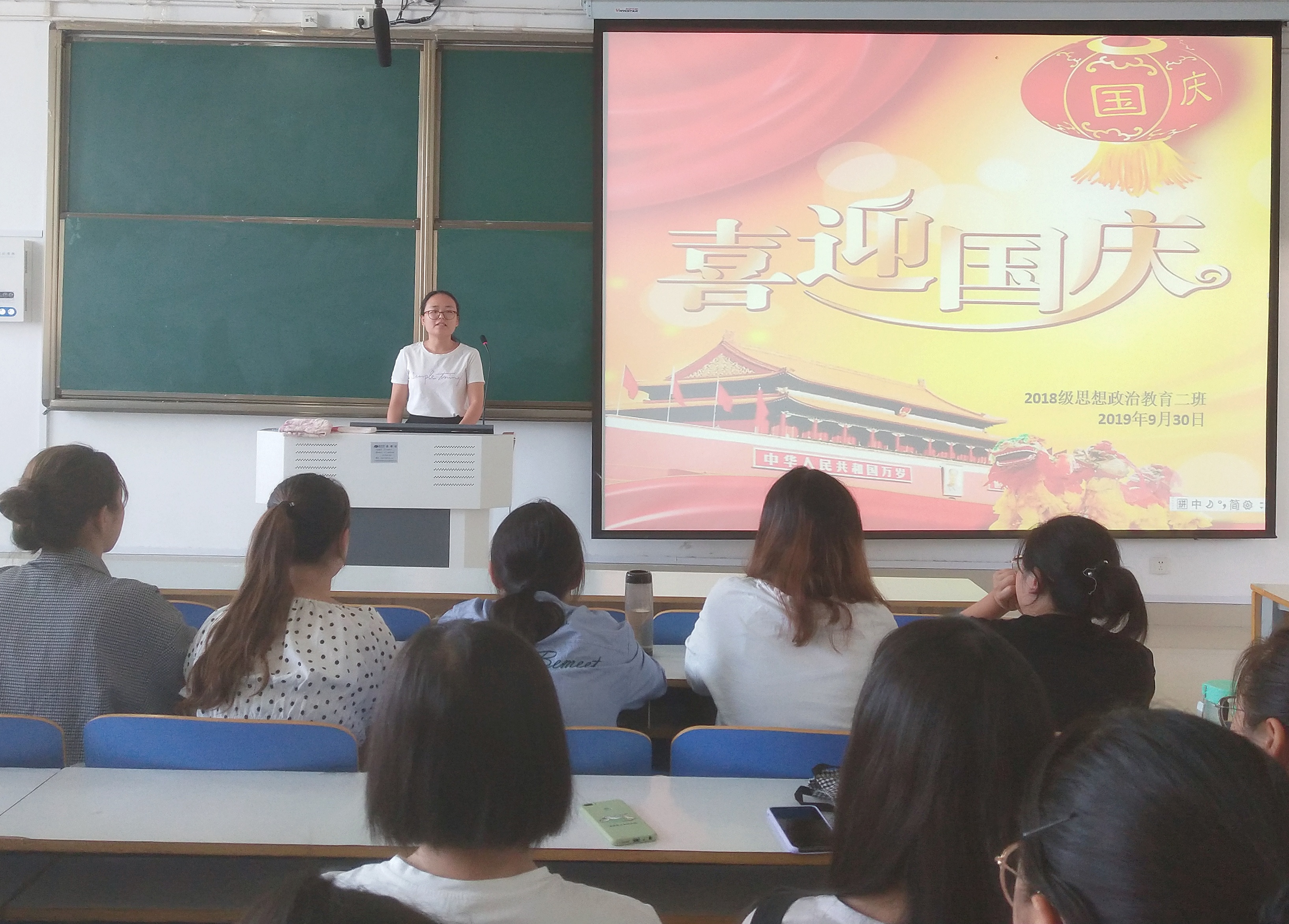 9月30日上午,我院2018级思想政治教育二班在社科楼514教室开展了“喜迎祖国七十华诞”主题班会。辅导员曹菁菁、2018级思想政治教育二班全体成员共同参加了本次班会。班会由班长杨康主持。