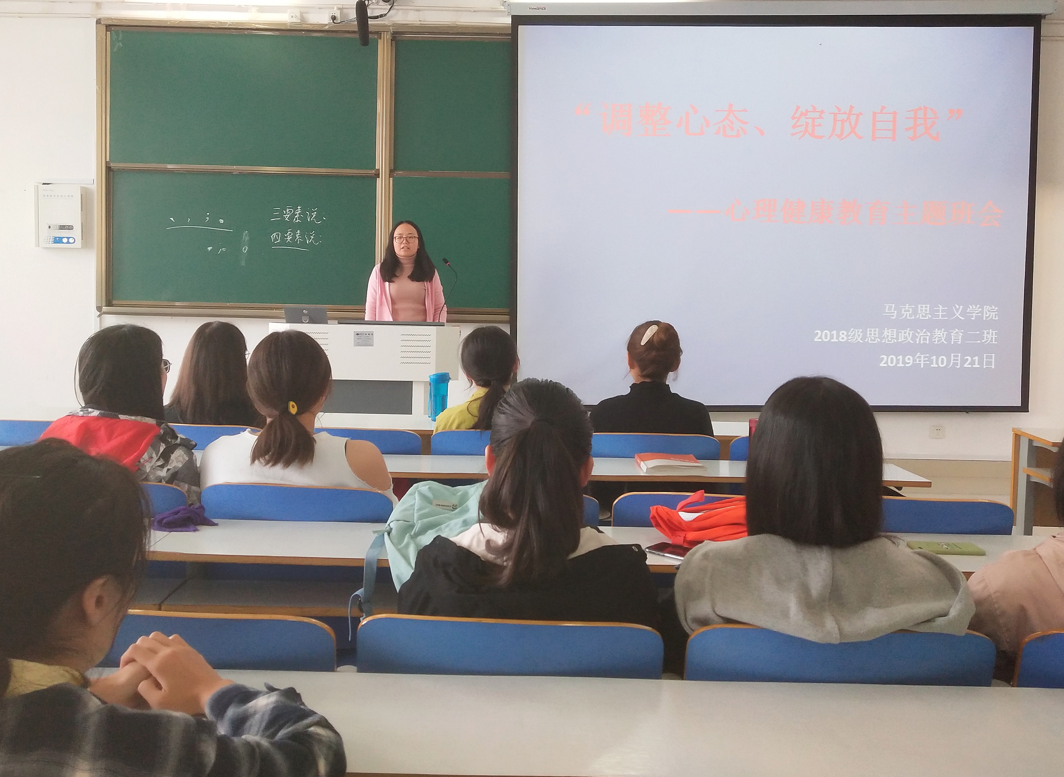 为进一步提高同学们的心理调节能力,保持良好的心理状态,10月21日上午,我院2018级思想政治教育二班于社科楼516教室顺利开展“调整心态,绽放自我”心理健康教育主题班会。我班邀请辅导员曹菁菁前来参加本次班会。班会由心理委员席妞主持。
