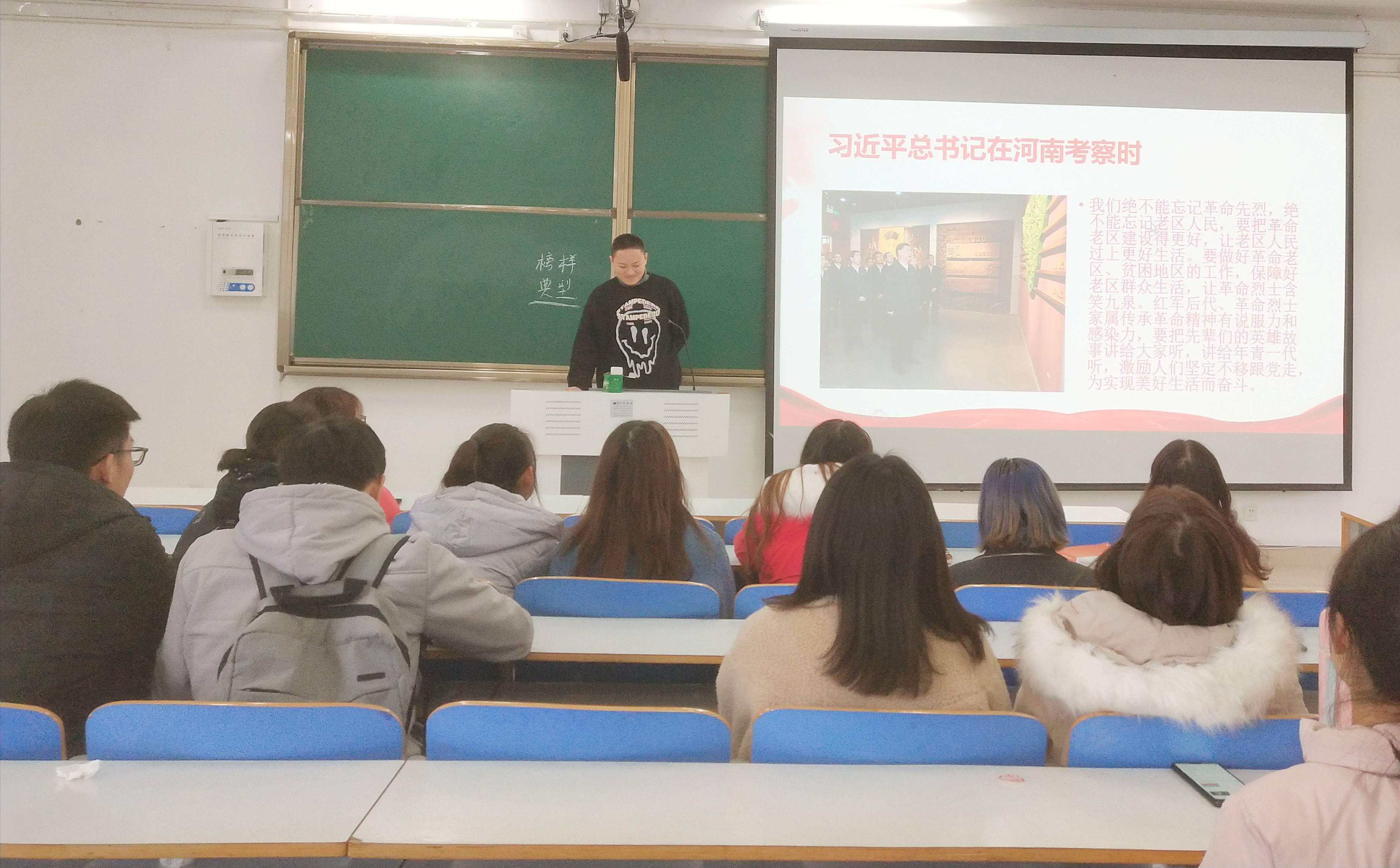 首先,刘苏醒通过图片的形式向大家说明了本次会议的主题及红色基因的内涵。她指出,红色基因是一种革命精神的传承,是中华民族的精神纽带;红色基因孕育了永放光芒的抗震救灾精神、载人航天精神等,鼓舞一代代中华儿女为中华民族伟大复兴而坚强自立、勇往直前。接着,同学们展开讨论,团小组成员张甜甜作出发言。她借习近平总书记在全国红色老区考察时讲述的语录,讲到红色基因展现了共产党人坚定的理想信念,昭示着共产党人宝贵的神圣初心,闪耀出共产党人温暖的人性光辉。最后,刘苏醒对本次会议做出总结。她强调,红色基因是共产党人的信仰根基、精神之源,党的事业薪火永传,红色血脉永续,中国青年必须传承理想信念的火种,焕发战斗的精神,使出拼搏的劲头。