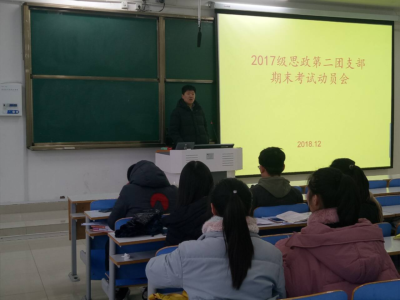12月26日上午,2017级思想政治教育二班在社科楼516教室召开了期末考前动员会,班级辅导员孙绪曙及2017级思想政治教育二班全体成员共同参加,班会由班长艾子元主持。