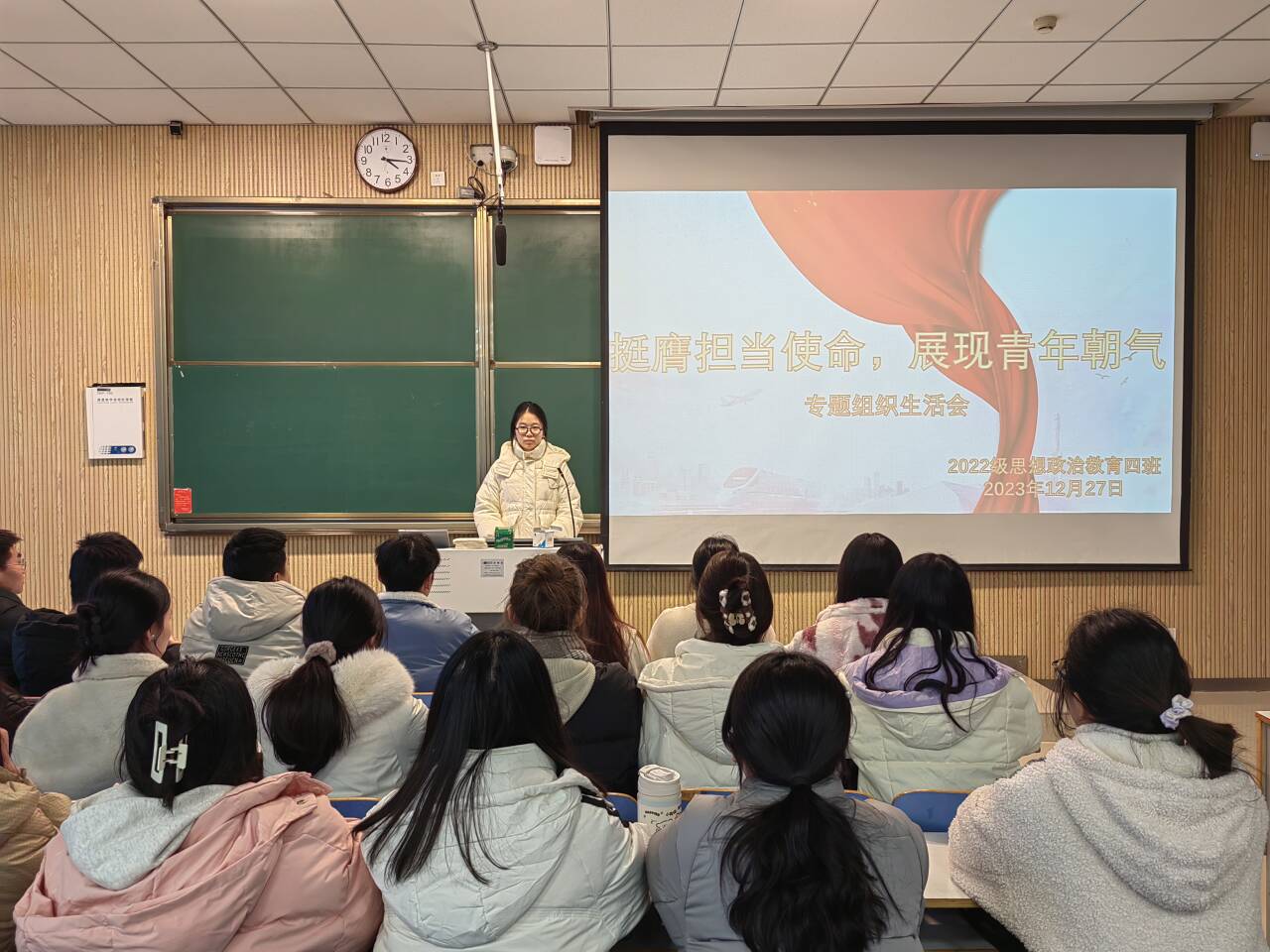 为进一步规范加强基层团组织建设,团结带领广大团员青年坚定不移地听党话、跟党走, 12月27日下午,WilliamHILL中国2022级思想政治教育四班在社科楼515教室召开“挺膺担当使命,展现青春朝气”专题组织生活会。我院2022级思想政治教育四班全体团员参与本次班会。本次会议由团支书牛志杰主持。