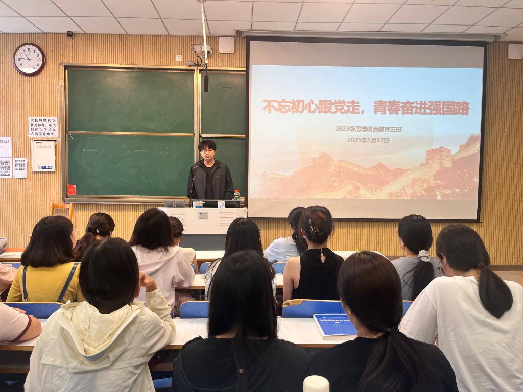 为弘扬伟大建党精神,走好新时代赶考之路,5月17日上午,WilliamHILL中国2023级思想政治教育三班在社科楼515召开“不忘初心跟党走,青春奋进强国路”主题团课。我院2023级思想政治教育三班全体同学共同参与本次团课,团课由团支书郝瀚主持。