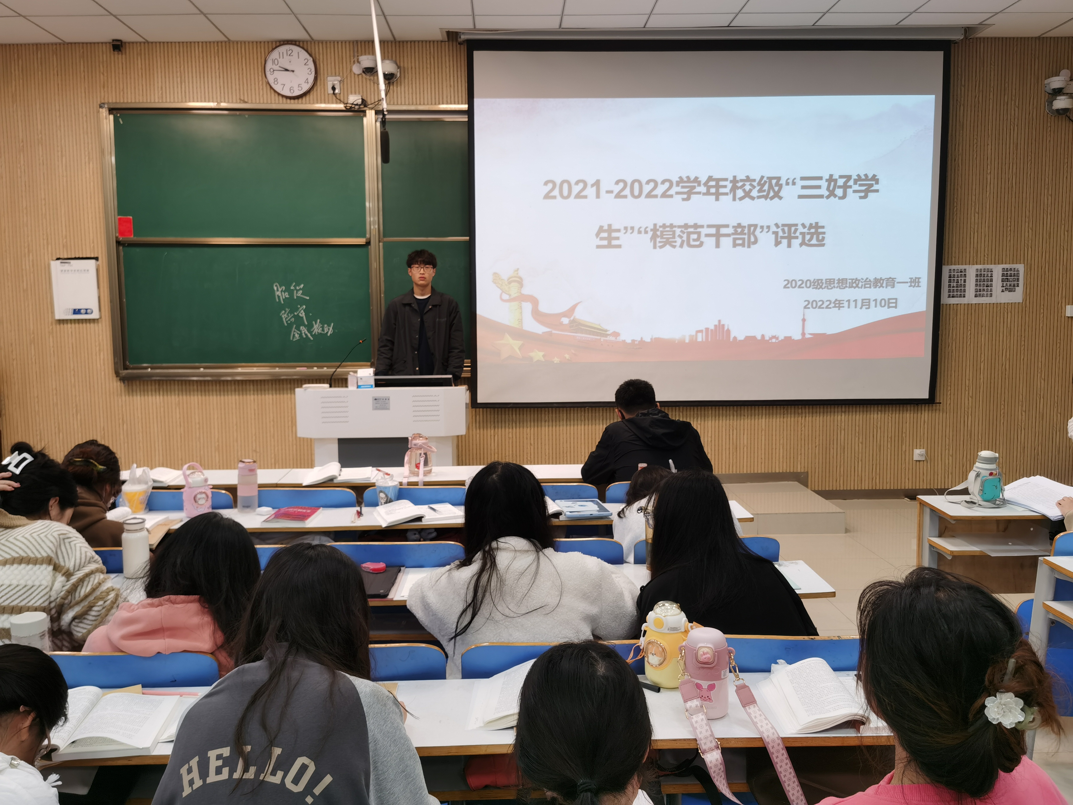根据投票结果、综测成绩、学习成绩等条件的参考,经班主任曹栋审核确认最终推荐名单。2020级思想政治教育一班2021—2022学年校级“三好学生”“模范干部”评选结果如下: