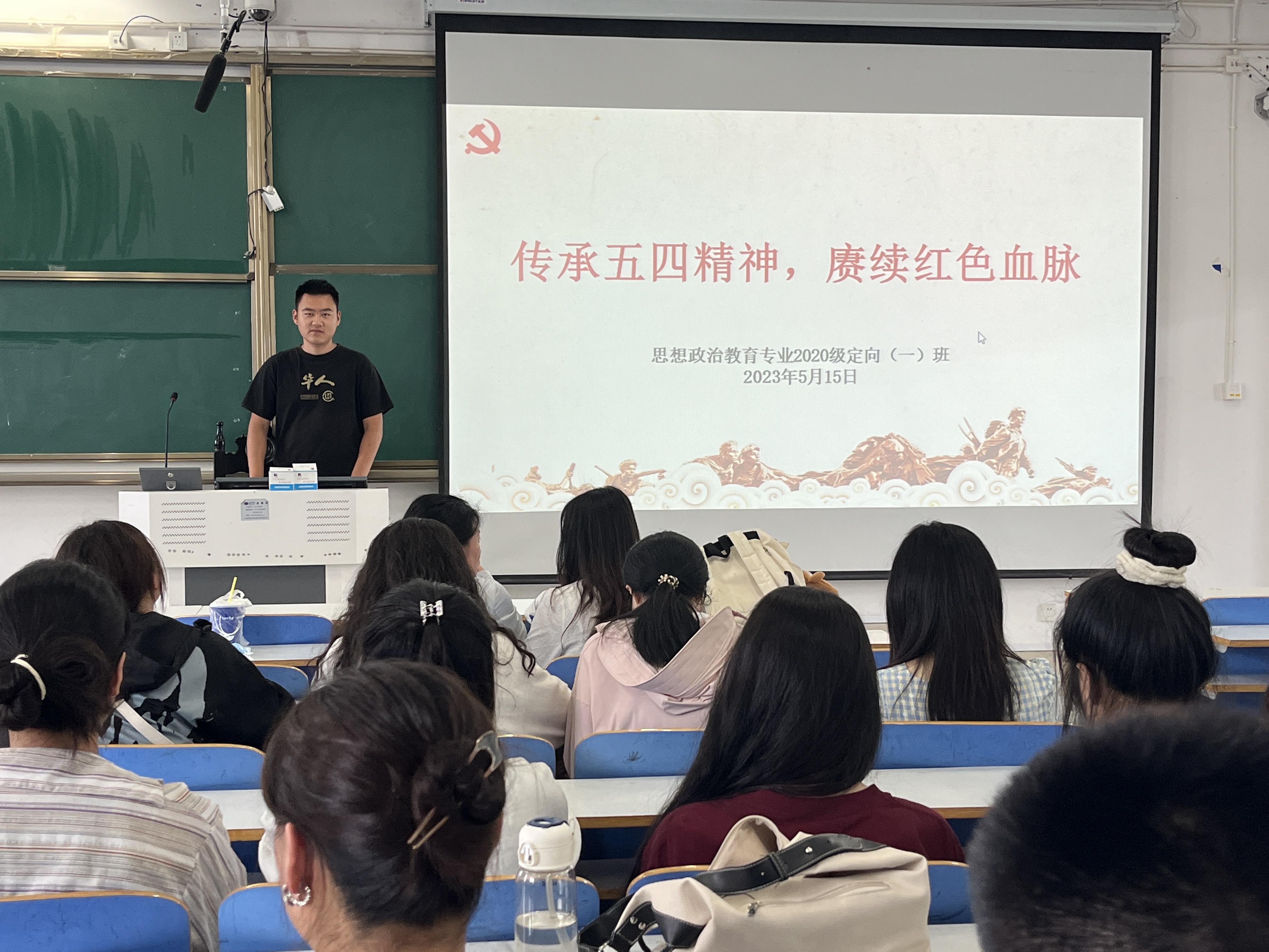 班会上,朱紫峰首先播放了视频材料,通过生动鲜活的画面,带领同学们回顾“五四运动”的发展历程,加深学生对五四运动历史意义和时代价值的认识,让同学们真切的感受到自“五四”以来,正是一批又一批有情怀、有理想、有才干的青年接力奋斗,推动着国家的奋力发展。接着,朱紫峰又提到习近平总书记在五四青年节的深情寄语,习近平总书记高度赞誉当代中国青年的担当精神,当代中国青年要有所作为,就必须投身人民的伟大奋斗。同人民一起奋斗,青春才能亮丽;同人民一起前进,青春才能昂扬;同人民一起梦想,青春才能无悔。让同学们体会到爱国主义不是一句口号,不是一种形式,而是一种实实在在的行动。同学们纷纷表示自己应该从身边的小事做起,勤奋学习知识、刻苦钻研,练就一身本领,以后能为国家的发展尽一份力,让祖国更加强大、昌盛、富饶。