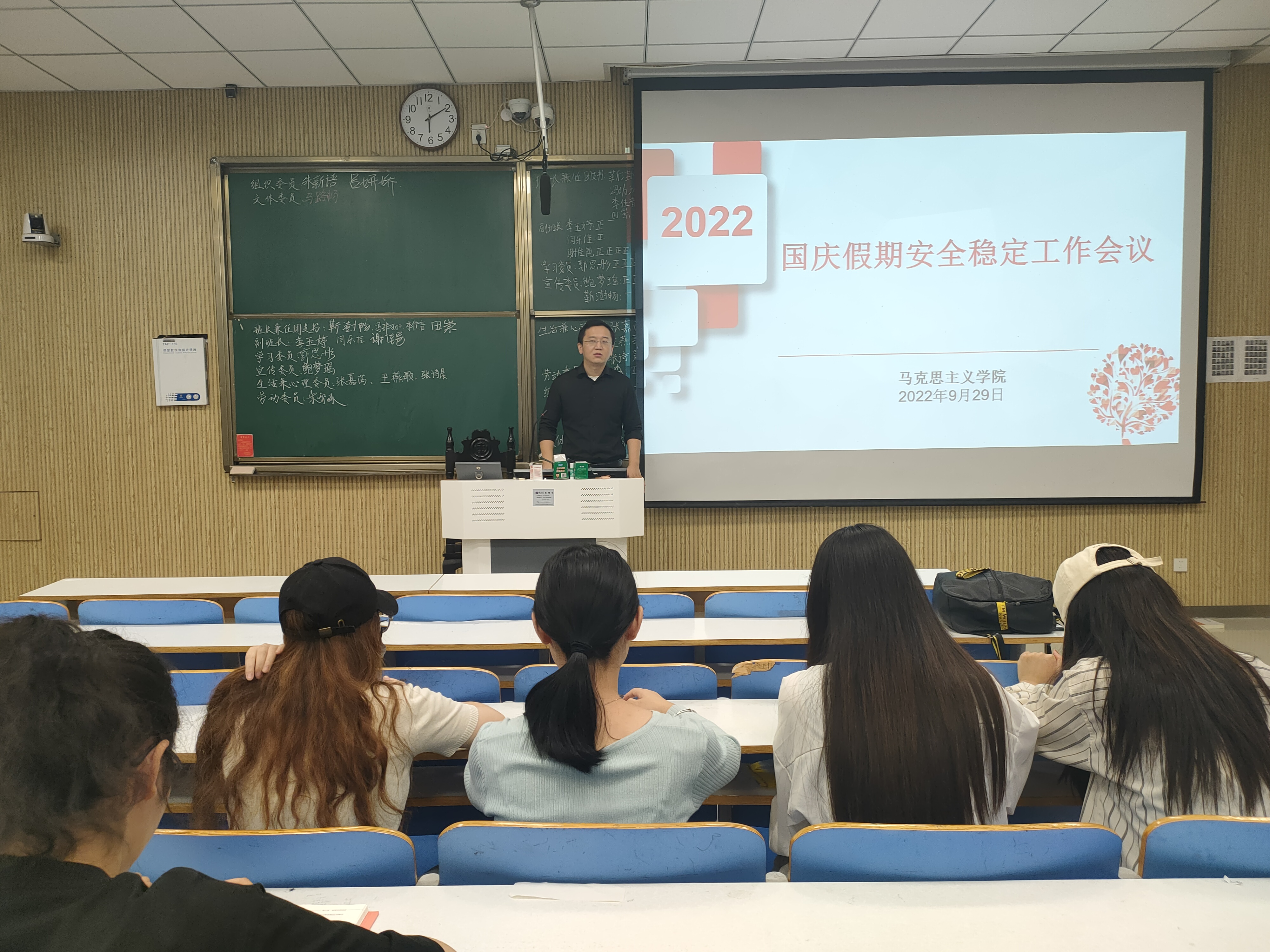 会议伊始,曹栋向全体学生传达了学校关于国庆假期放假安排。接着,曹栋向同学们详细说明了国庆期间的请假流程,按照信阳师范学院防疫要求,学生出校必须向辅导员进行提前报备,详细说明个人行动轨迹,不可隐瞒不报。随后,曹栋多次向学生强调假期外出安全问题,着重强调了按时参加全员核酸、请假学生活动范围以及返校时间等问题。最后,曹栋对国庆假期安全稳定工作会议进行总结。