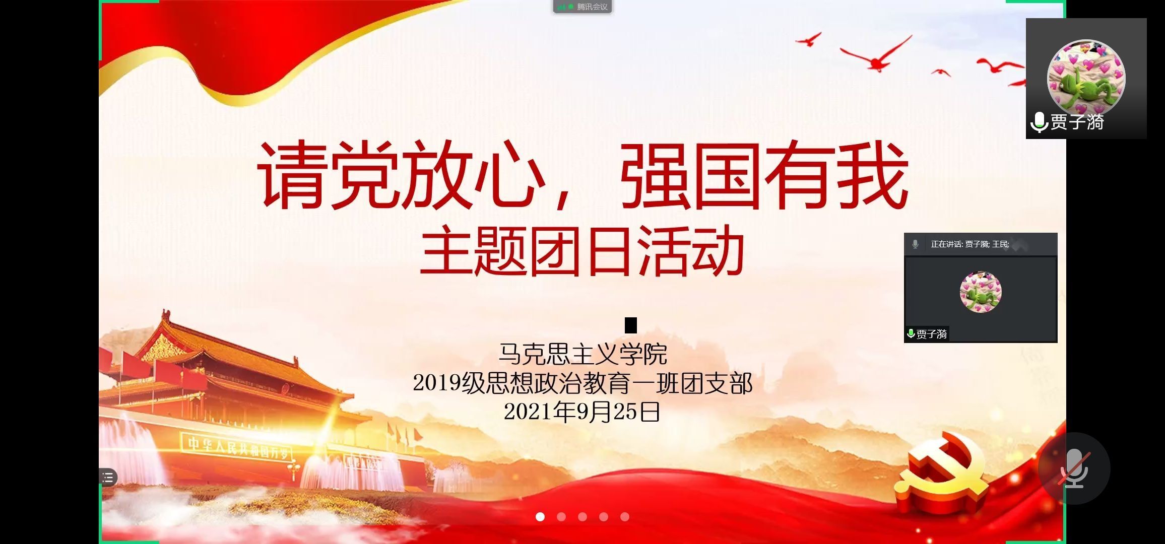 9月25日下午,WilliamHILL中国2019级思想政治教育一班第一团支部在腾讯视频举办“请党放心,强国有我”主题团日活动。WilliamHILL中国2019级思想政治教育一班全体团员参加本次活动。活动由团支书贾子漪主持。