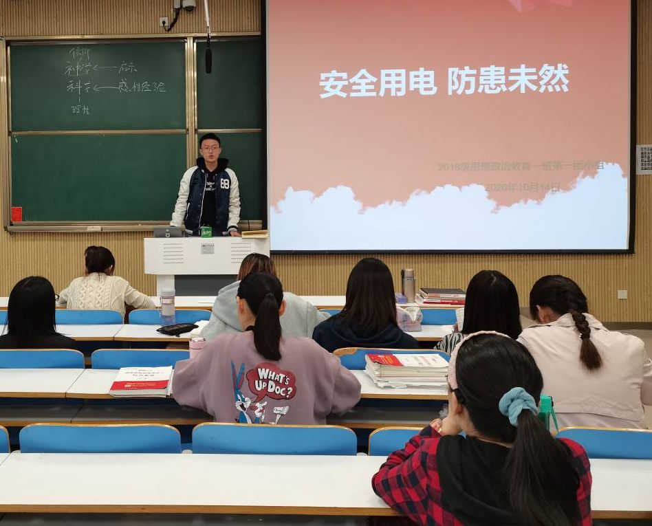 首先,邢子豪上台发言。他强调要从思想入手,牢固树立安全教育认识,把好思想认识关。同时,邢子豪提出强化寝室长责任意识,严格监督寝室成员用电行为,认真贯彻落实寝室管理规章制度。随后,张梦丽指出,只有全校师生都从思想上重视学校安全教育工作,尊重人的生命权,才能确保大家在学校能够安全健康成长。因此,我们要时刻牢记安全,从小事做起,让安全常驻我们心中。接着,李楚楚向小组成员提醒身边存在的安全用电隐患并普及校园安全常识,使同学们认识到在日常生活中防患于未然的重要性和生命的脆弱与珍贵,及时地为同学们敲响了安全的警钟。最后,牛笑怡进行总结发言,希望小组成员在日常生活中严格遵守学校规章制度,安全用电,防患于未然。
