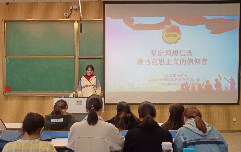 首先,卞晓莹上台发言,她指出,走好新时代的长征路,我们需要坚定理想信念、矢志拼搏奋斗,要认真学习马克思主义理论,学习党史、新中国史、改革开放史、社会主义发展史,在学思践行中坚定理想信念,在奋发有为中践行初心使命。随后,樊梦珂结合自身经历向小组成员分享青年大学生应如何坚定理想信念。她认为,我们应该真正懂得马克思主义,真正信仰马克思主义,真正做到理论联系实际,知行统一。最后,陈文博进行总结发言。她强调,心有所信,方能行远。作为新时代青年的我们应坚持马克思主义信仰不动摇,增强自身定力、自信和智慧,努力为实现“两个一百年”奋斗目标和实现中华民族伟大复兴的中国梦贡献力量。