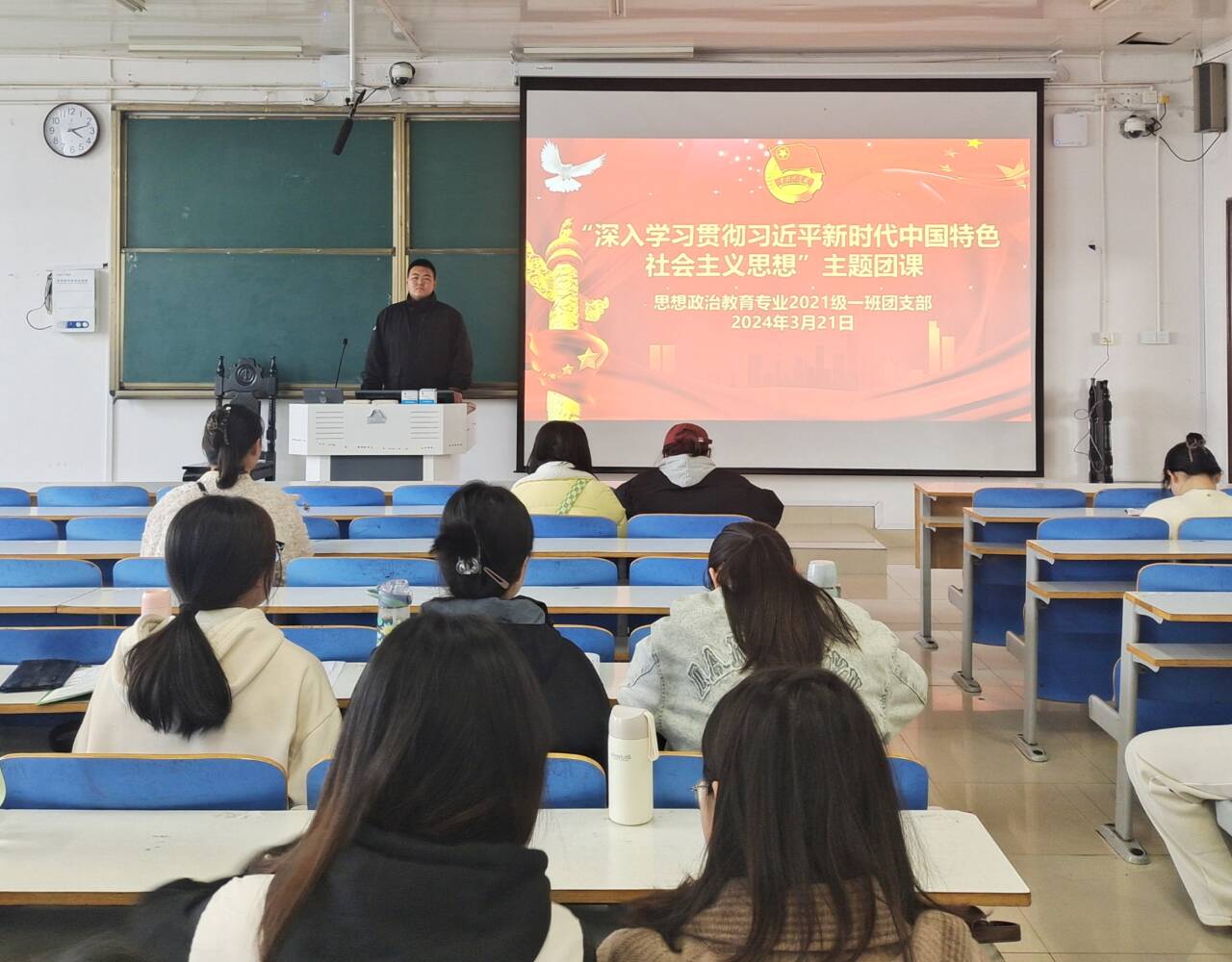 3月21日下午,WilliamHILL中国2021级思想政治教育一班在社科楼514教室召开“深入开展学习贯彻习近平新时代中国特色社会主义思想主题教育”主题团课。2021级思想政治教育一班全体团员参加此次团课。团课由团支书戴翰林主持。