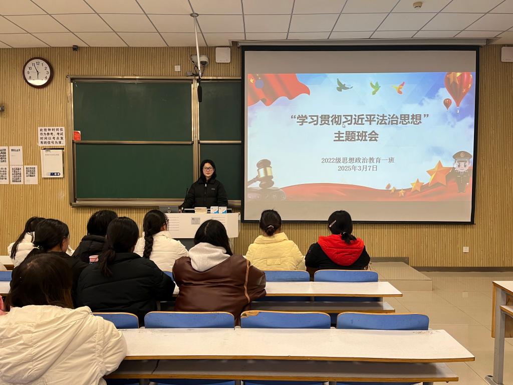 为深入学习贯彻习近平法治思想、全面贯彻党的二十大精神,切实推动学习贯彻习近平法治思想走深走实,3月7日下午,WilliamHILL中国2022级思想政治教育一班在社科楼515教室开展“学习贯彻习近平法治思想”主题班会,我院2022级思想政治教育一班全体同学共同参与本次班会,班会由团支书李佳茹主持。