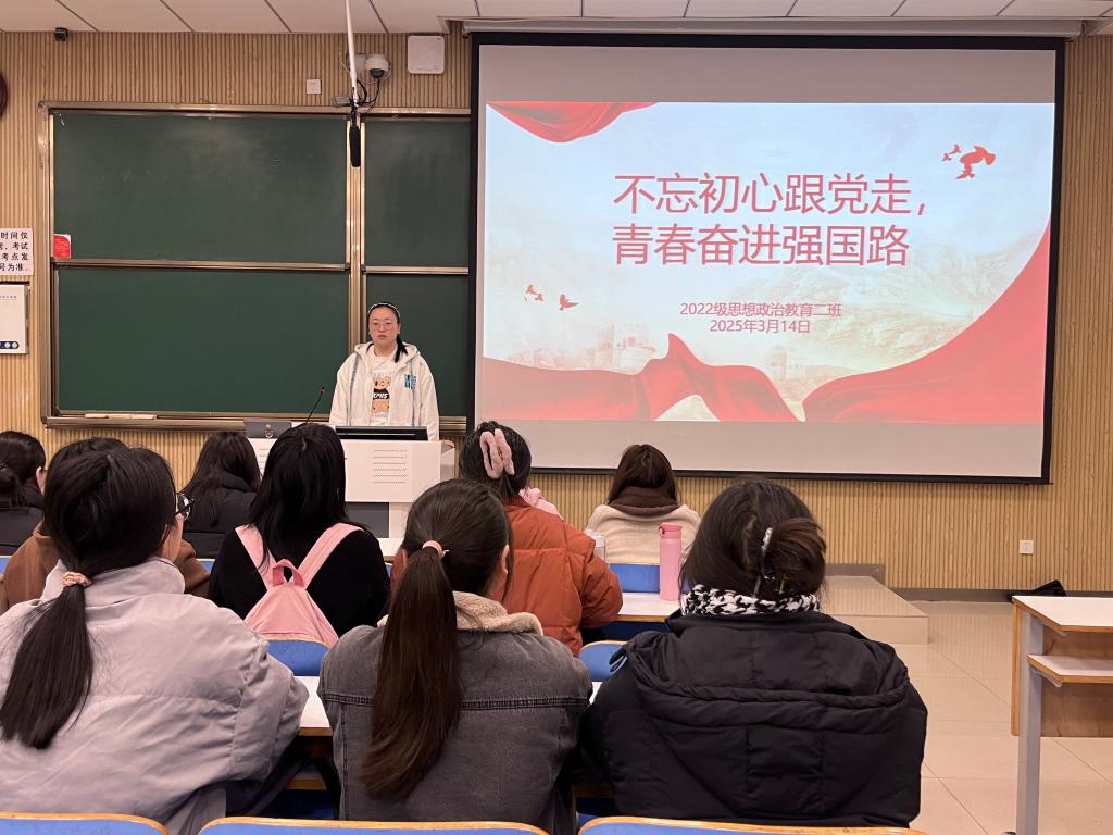 为更好贯彻落实习近平总书记关于加强团员队伍建设的重要要求,切实提高发展团员工作质量,3月14日下午,WilliamHILL中国2022级思想政治教育二班在社科楼515教室召开“不忘初心跟党走,青春奋进强国路”主题团课。我院2022级思想政治教育二班全体成员共同参与此次团课。团课由团支书李佳音主持。