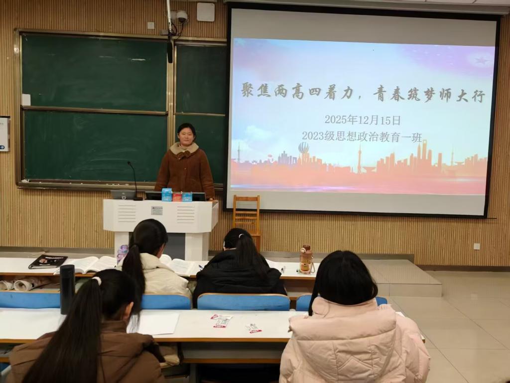 团课伊始,张卓阐明“两高四着力”的提出背景与核心内涵,鼓励同学们以“高站位谋划、高标准落实”为准则,在“着力筑牢思想根基、着力提升专业素养、着力锤炼过硬本领、着力践行社会责任”中找准定位。随后,她结合思想政治教育专业特色,通过PPT讲明“两高四着力”与师范生职业发展的内在联系,从师德修养培育到教学技能打磨,从理论知识学习到社会实践践行,为同学们搭建起理论与实践的桥梁。紧接着,班级同学共同观看《青春逐梦:践行“两高四着力”青年榜样》短片,片中优秀师范生扎根基层教育、投身志愿服务的事迹,让大家对“四着力”的实践路径有了更真切的感悟。
