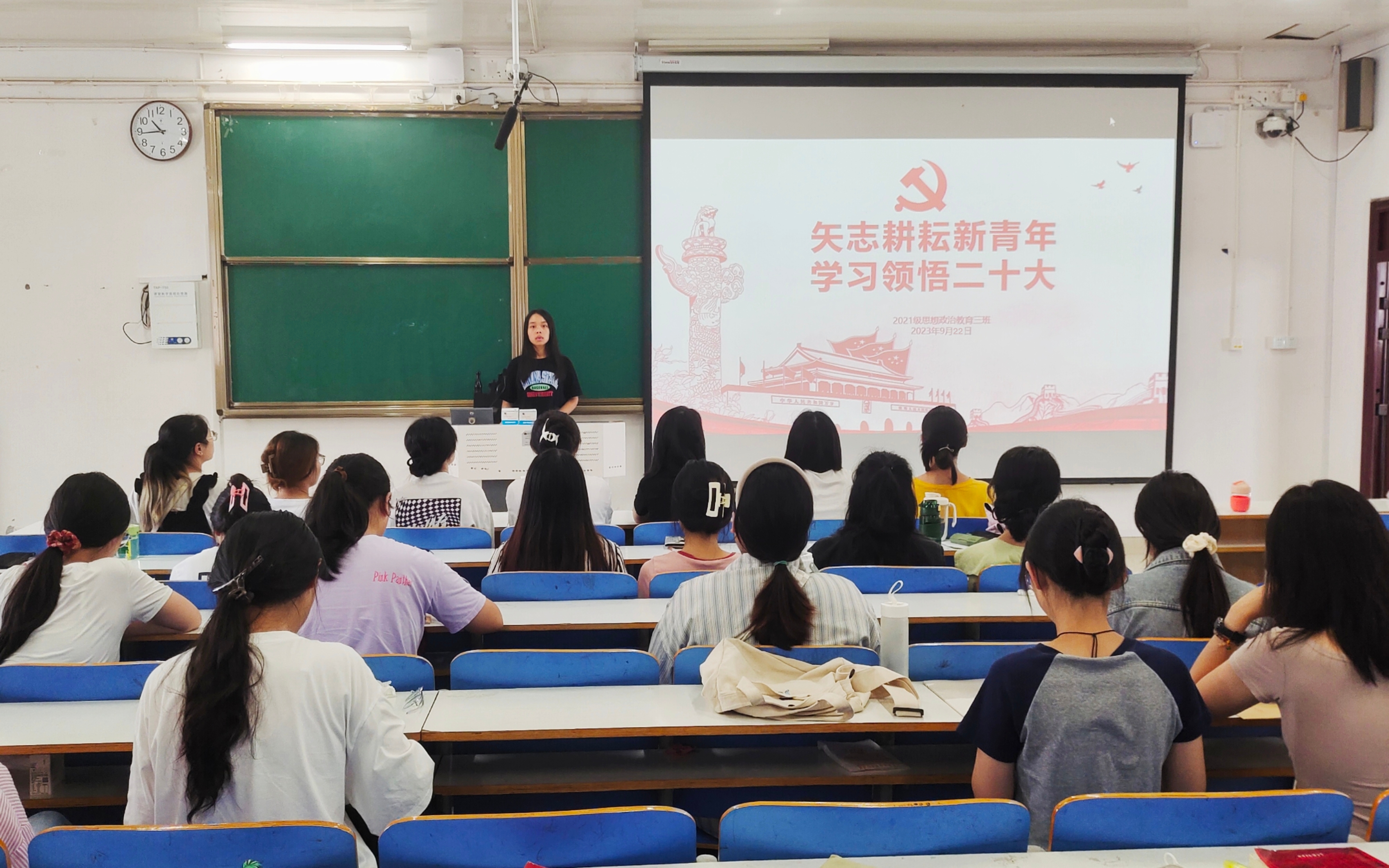 会议伊始,王岚霄对参会团员进行清点。她指出,中国共产党第二十次全国代表大会,是在全党全国各族人民迈上全面建设社会主义现代化国家新征程、向第二个百年奋斗目标进军的关键时刻召开的一次十分重要的大会。而青年一代肩负着实现伟大复兴中国梦的伟任,深入学习二十大精神是每个团员的责任。接着,她带领大家学习了习近平总书记在二十大报告中的系列言论。最后,王岚霄号召大家积极学习并利用专业知识,认真思考思政学子如何在新时代切实努力,发扬“老黄牛”精神,助力伟大复兴中国梦,本次团课在掌声中落下帷幕。