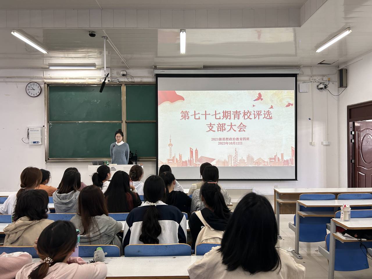会议伊始,学习委员史恪萍发起学习通线上签到,确保全员到场参与。刘珂含指出,本次会议的目的是从入党积极分子中选拔更优秀的人才,并向我班团员宣读青年共产主义学校推优要求和评选的具体流程。随后,刘珂含公布八位竞选人的名单和竞选顺序。紧接着,八位竞选人依次上台进行竞选。刘珂含强调,本着公平、公正、公开的原则,采取匿名投票的方式,每人两票,八位竞选人分别从个人实际出发,联系学习情况、思想道德素质、自身优点与特长等多方面进行发言,团员们严格遵守规则,有序进行投票。最后,刘珂含将投票结果在黑板上进行公示,拍照留存后并发布至我班班级群。评选大会在全体团员的参与与监督下结束。