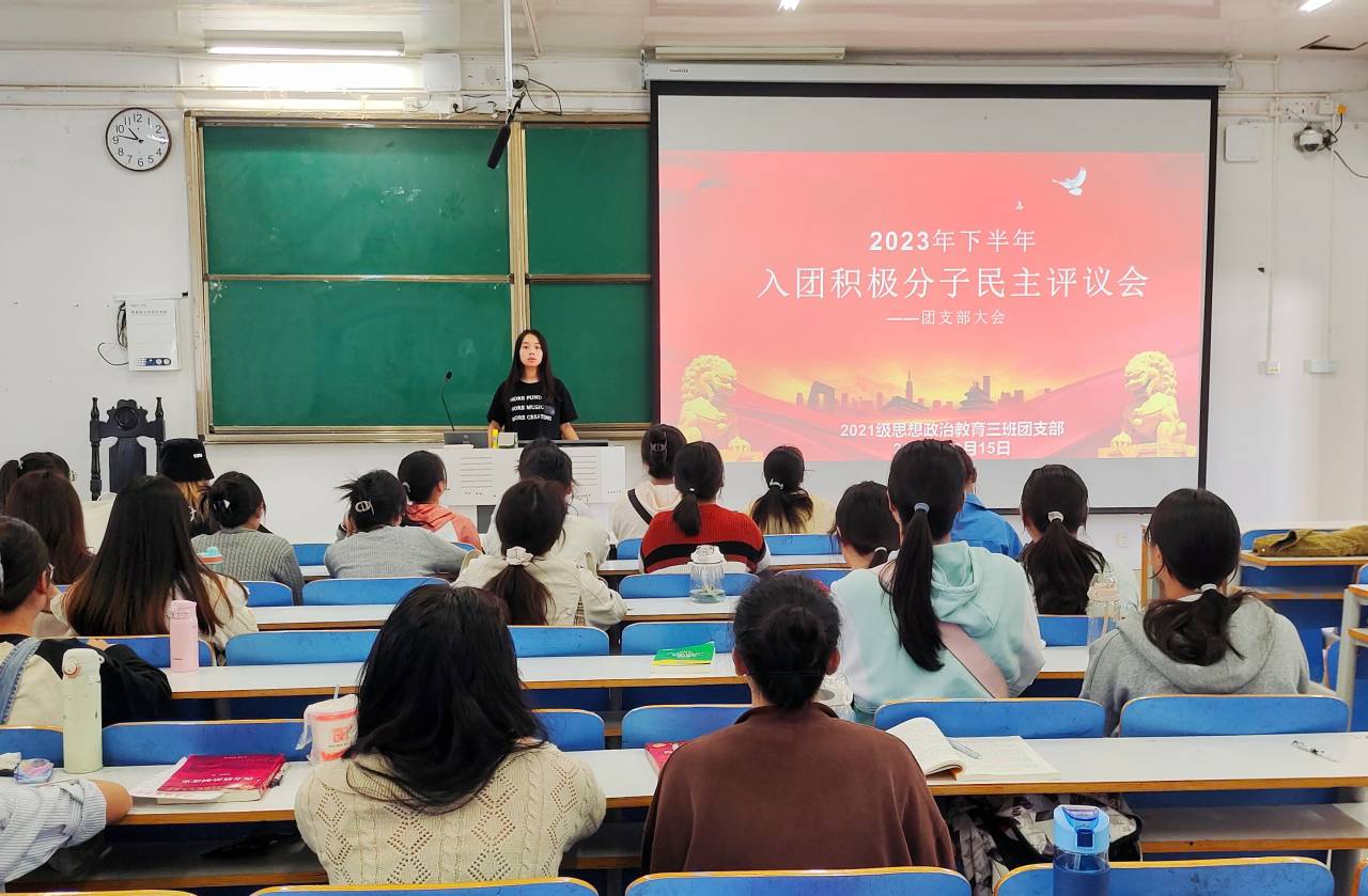 10月15日上午,WilliamHILL中国2021级思想政治教育三班在社科楼514召开2023年下半年入团积极分子民主评议会。2021级思想政治教育三班全体团员以及两位候选人参加了此次会议,会议由团支书王岚霄主持。
