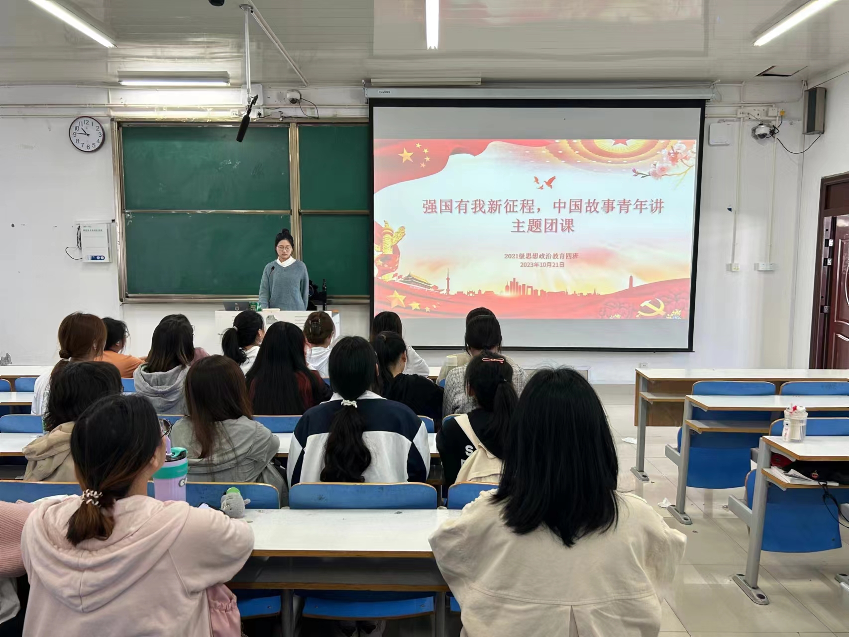 团课伊始,刘珂含指出,开展本次团课目的是让同学们更好的了解中国故事,向着共产主义远大理想和中国特色社会主义共同理想不断奋进。紧接着,刘珂含带领同学们回顾党的光辉历程,回顾建国以来发生的翻天覆地的变化和伟大成就,展望美好前景。随后,通过击鼓传花的方式让六位同学上台阐述自己对新时代青年讲好中国故事的看法,台下的同学写下自己的团课感悟与心得体会,并互相交流分享。最后,刘珂含对本次团课进行总结。她指出,作为勇担民族重任的时代新人,当了解中国故事,筑牢中国情怀,讲好中国故事,把个人的“小我”融入国家的“大我”、人民的“大我”之中。