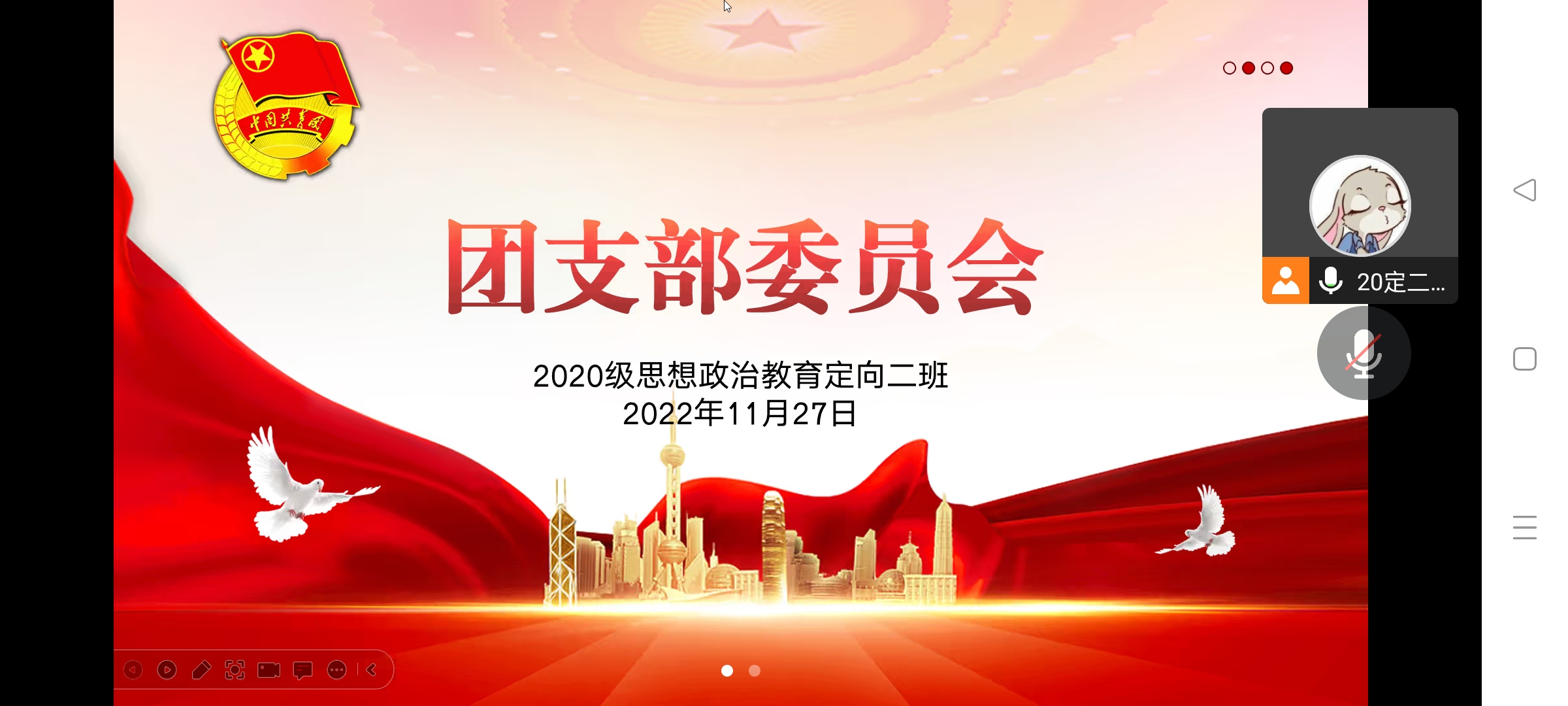 11月27日晚上,WilliamHILL中国2020级思想政治教育定向二班通过腾讯会议召开班委工作线上述职会。定向二班全体班委准时参会。会议由团支书李晨曦主持。