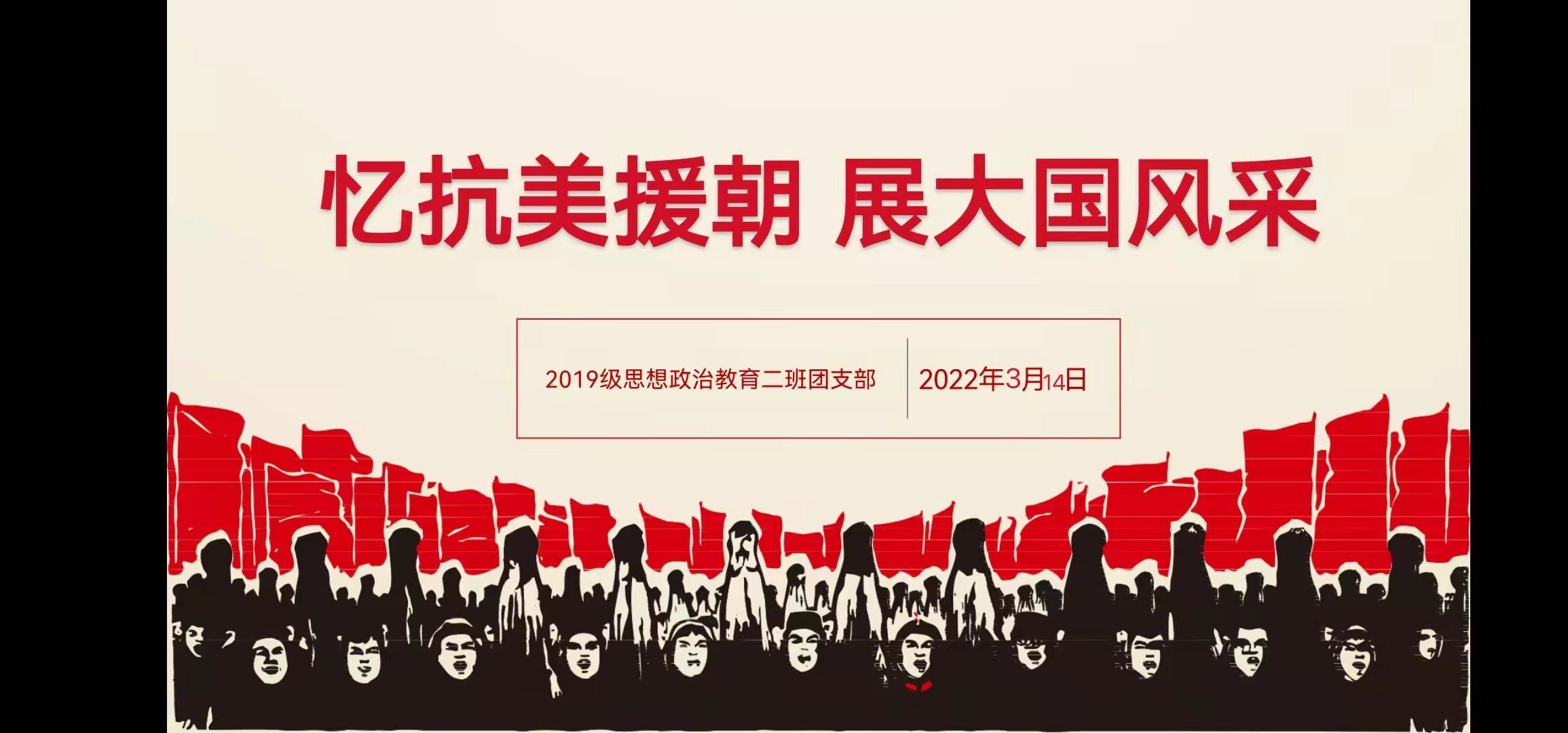 为缅怀革命先烈,弘扬民族精神,加强团员青年爱国主义教育,厚植爱国主义情怀,3月14日上午,我院2019级思想政治教育二班在腾讯会议召开“忆抗美援朝,展大国风采”网上主题团课。2019级思想政治教育二班全体成员共同参会。会议由团支书孙雅娴主持。