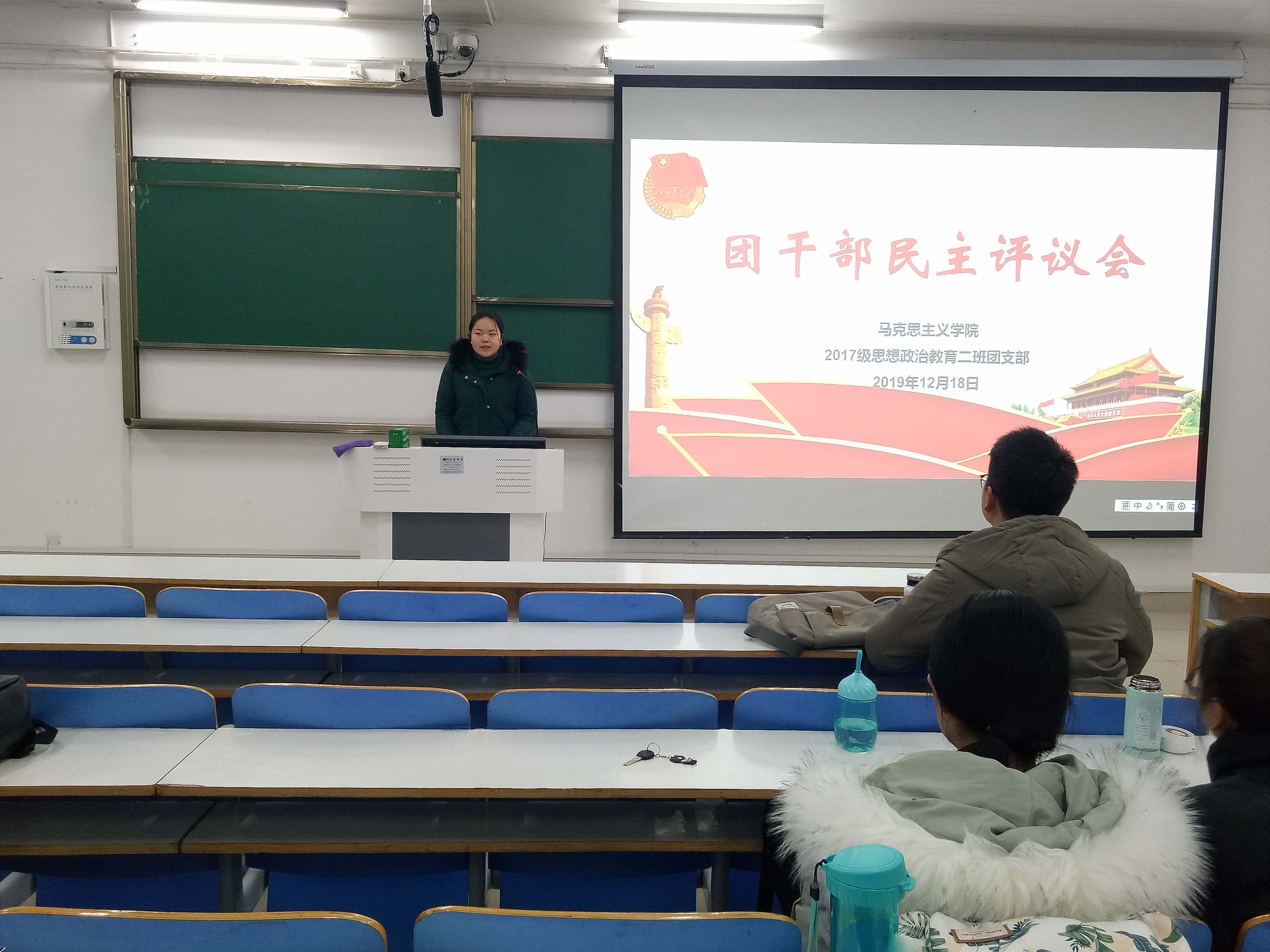 12月18日上午,2017级思想政治教育第二团支部全体团员在社科楼514教室开展了以“批评与自我批评”为主题的团干部民主评议会,会议由团支部书记秦康怡主持。