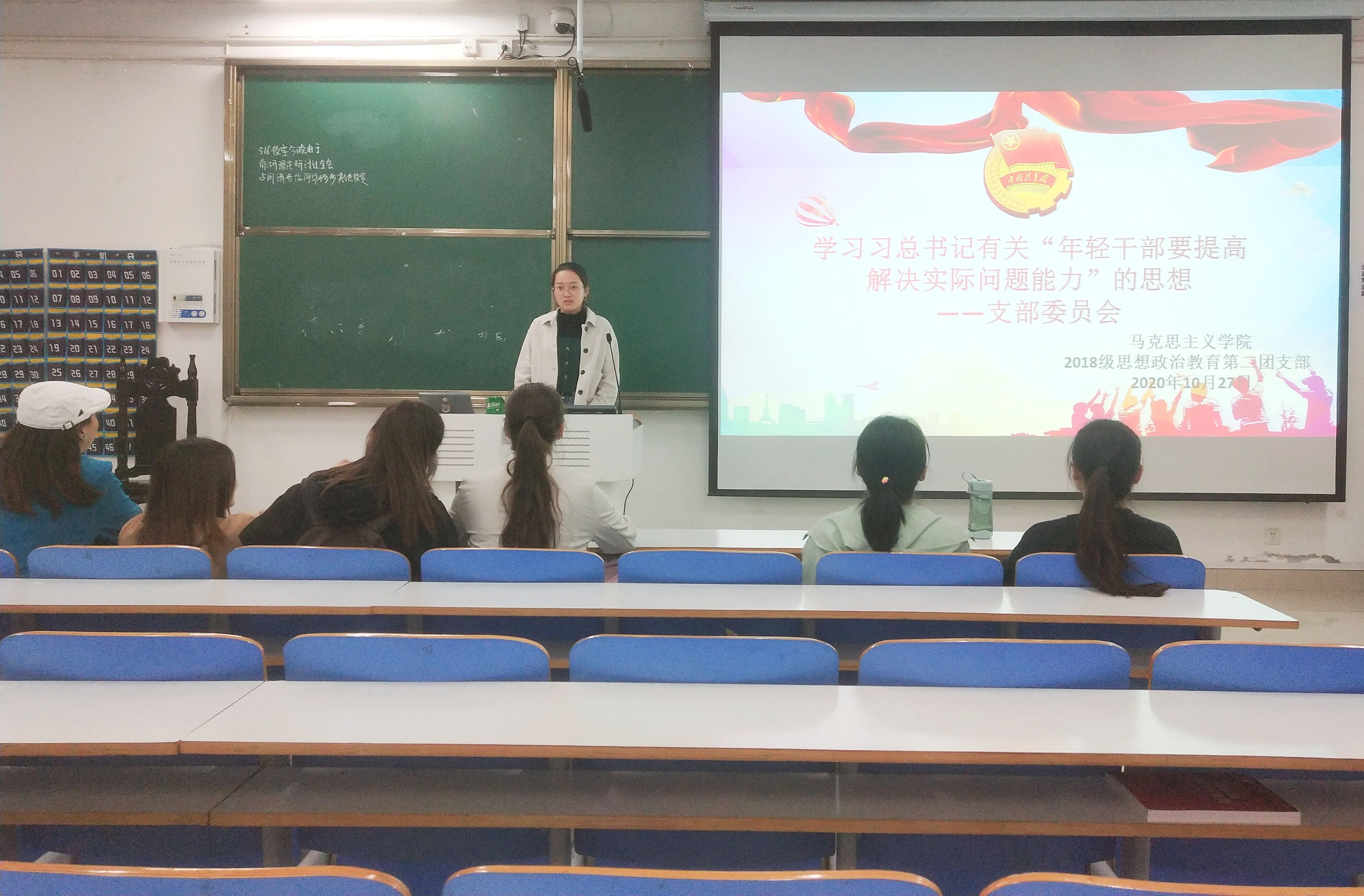 10月27日上午,我院2018级思想政治教育第二团支部在社科楼516教室顺利召开主题为“学习习近平总书记有关‘年轻干部要提高解决实际问题能力’的思想”支部委员会。本次会议由团支部书记黄子晋主持。