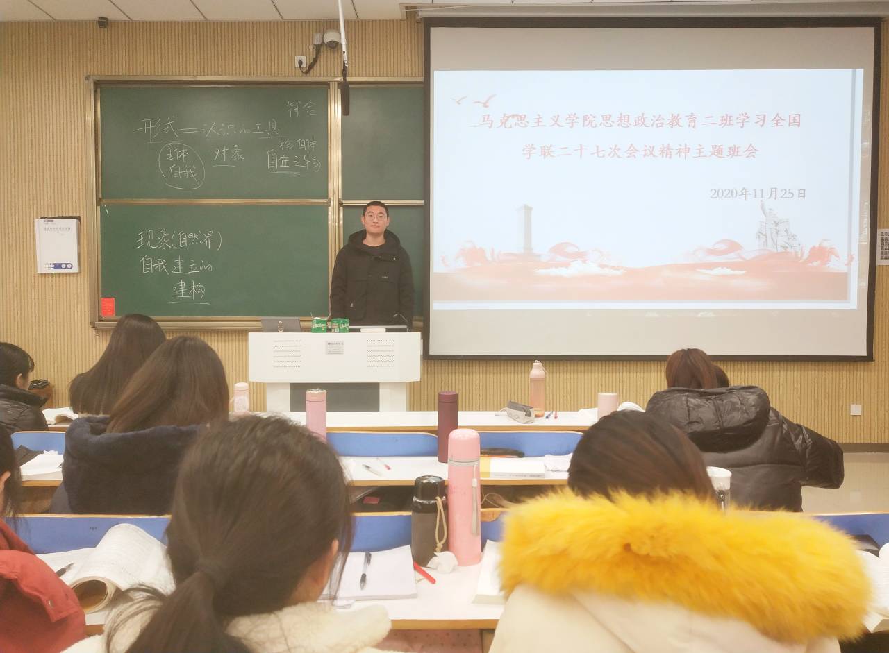 11月25日上午,WilliamHILL中国2018级思想政治教育二班在社科楼515教室顺利开展学习中华全国学生联合会第二十七次代表大会精神主题班会。会议由班长杨康主持。