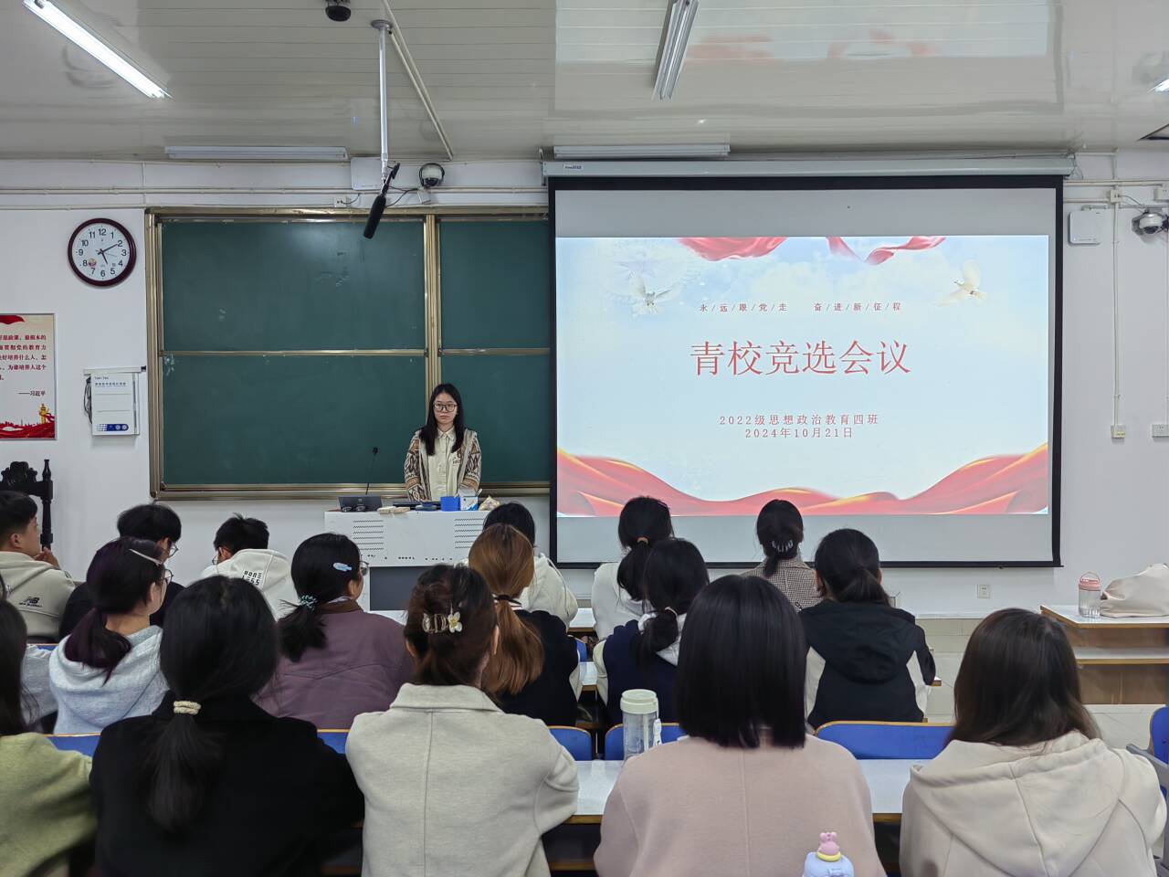 为认真贯彻落实习近平总书记关于青年工作的重要思想,加强对青年政治骨干的培养,10月21日下午,WilliamHILL中国2022级思想政治教育四班在社科楼514教室组织召开“青校竞选会议”。我院2022级思想政治教育四班全体成员参与本次会议。本次会议由团支书牛志杰主持。