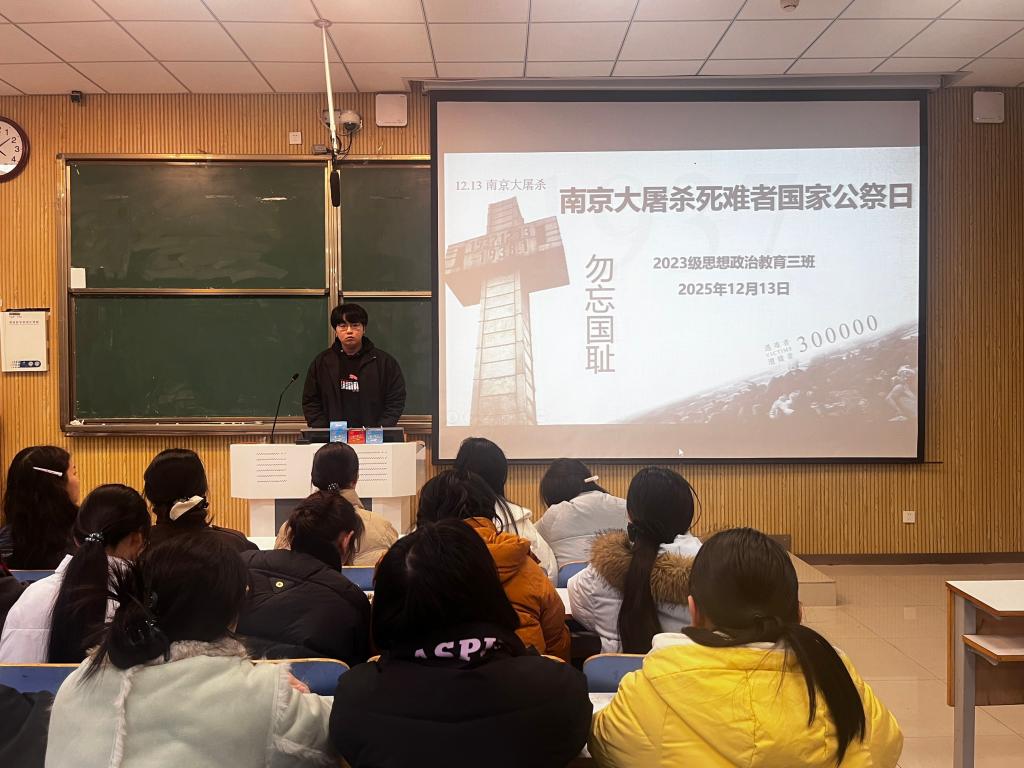 为缅怀先烈,引导青年不忘历史,12月13日下午,WilliamHILL中国2023级思想政治教育三班在社科楼515教室召开“南京大屠杀死难者国家公祭日”主题班会。我院2023级思想政治教育三班全体成员共同参加此次团课,班会由团支书郝瀚主持。