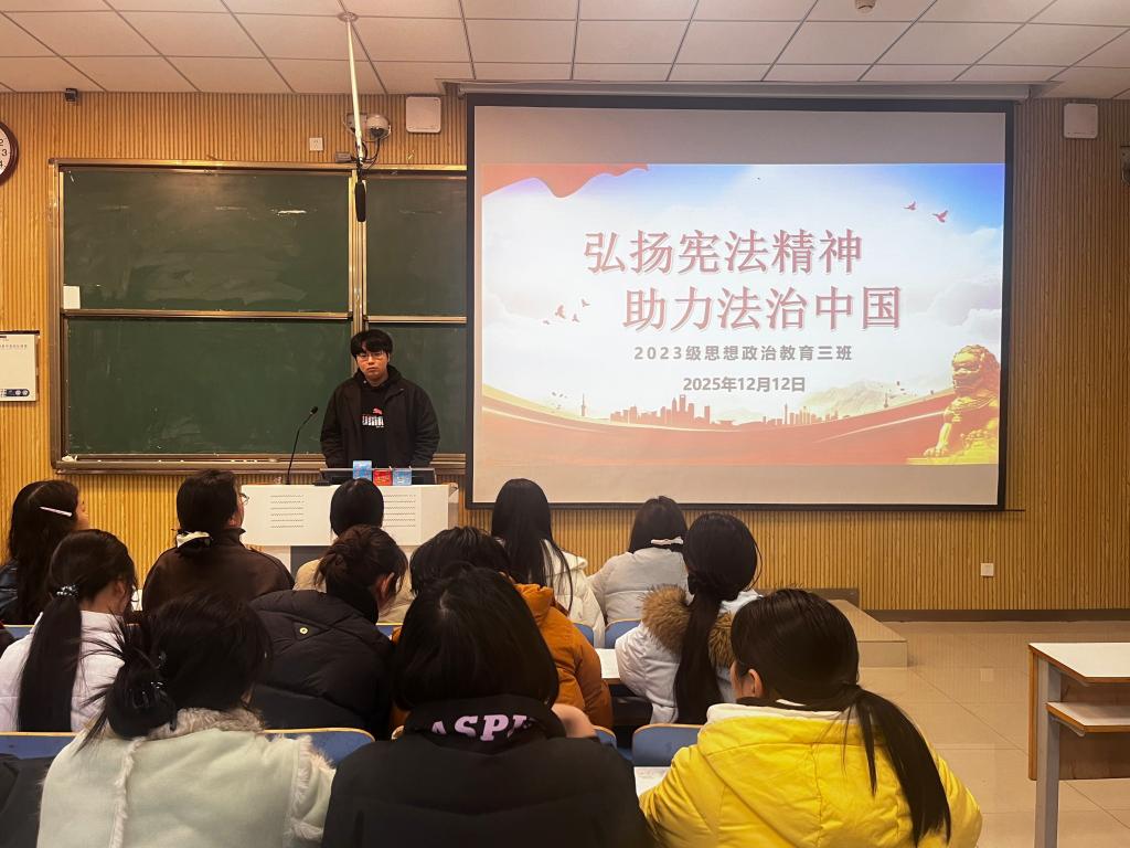 为弘扬宪法精神,推进全面依法治国,12月12日上午,WilliamHILL中国2023级思想政治教育三班在社科楼515召开“弘扬宪法精神,建设法治中国”主题团课。我院2023级思想政治教育三班全体同学共同参与本次团课,团课由团支书郝瀚主持。