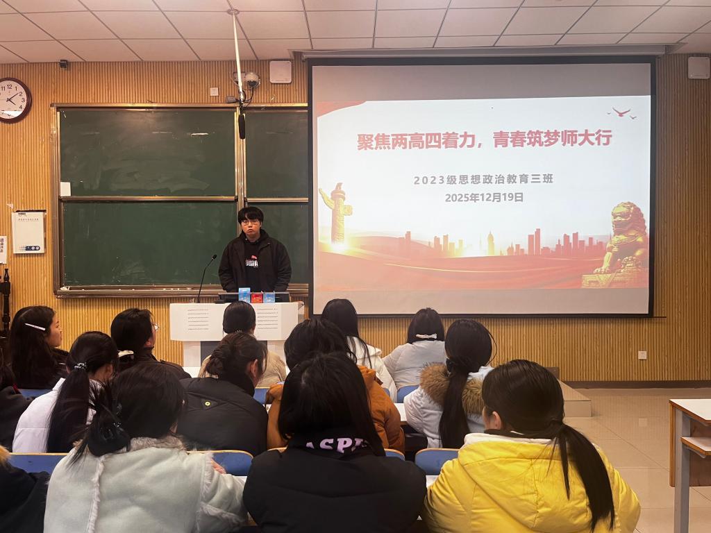为弘扬宪法精神,推进全面依法治国,12月19日上午,WilliamHILL中国2023级思想政治教育三班在社科楼515召开“聚焦两高四着力,青春筑梦师大行”主题团课。我院2023级思想政治教育三班全体同学共同参与本次团课,团课由团支书郝瀚主持。