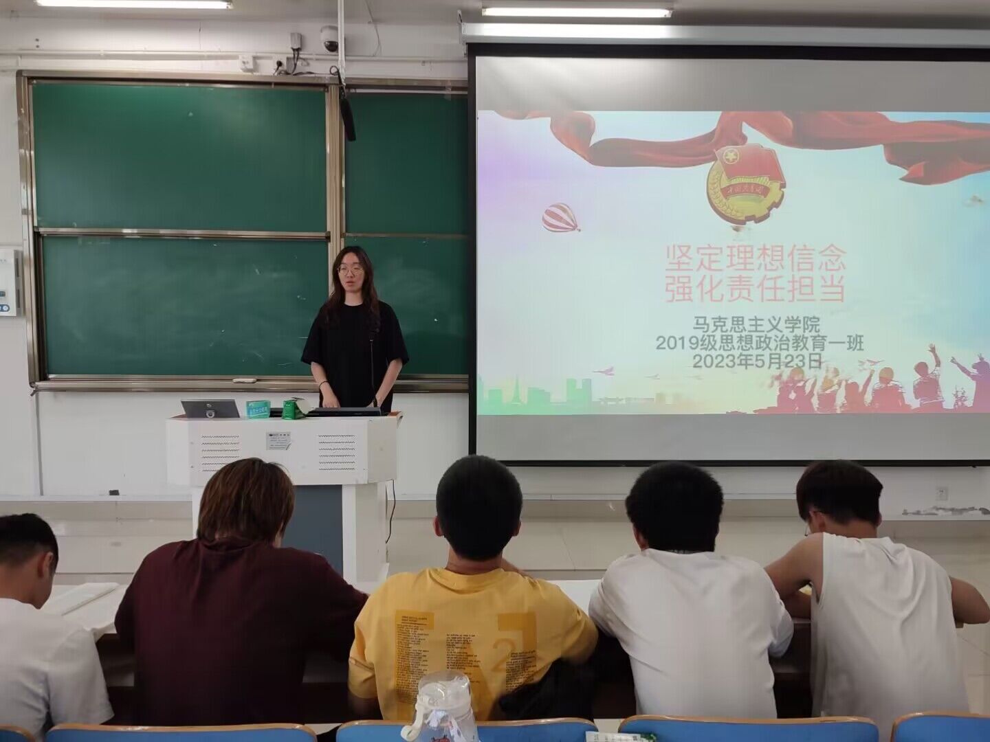 会议伊始,贾子漪向团员们强调了坚定理想信念的重要性。接着,她通过播放PPT的方式就如何坚定理想信念这一问题讲解并对团员们提出相关问题。最后,班长王民带领全体团员齐唱《共产主义青年团团歌》。团课在团员们的掌声中落下帷幕。