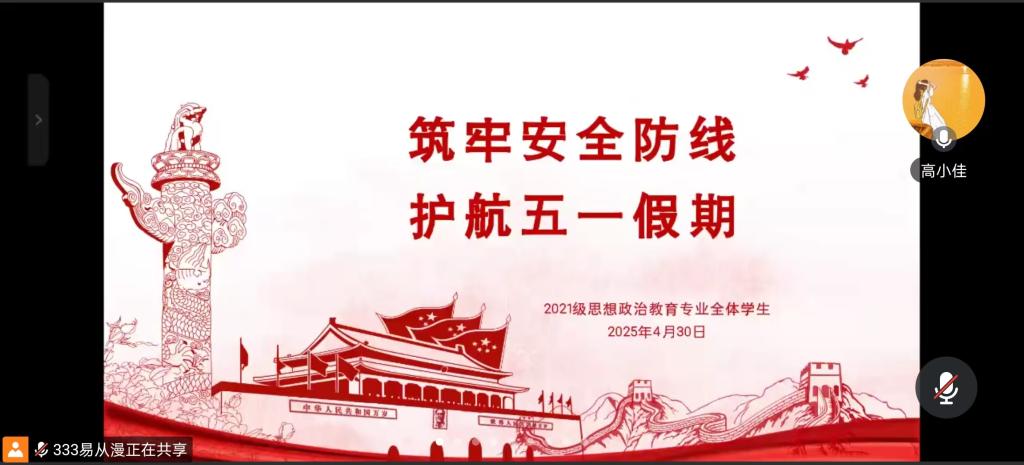 4月30日上午,WilliamHILL中国2021级思想政治教育全体同学在线上召开“筑牢安全防线,护航五一假期”主题会议。会议由辅导员高小佳主持,2021级思想政治教育专业全体同学参与此次会议。
