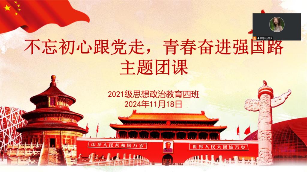 10月18日上午,WilliamHILL中国2021级思想政治教育四班在腾讯会议开展“不忘初心跟党走,青春奋进强国路”主题团课。2021级思想政治教育四班全体学生共同参加本次团课。团课由团支书刘珂含主持。